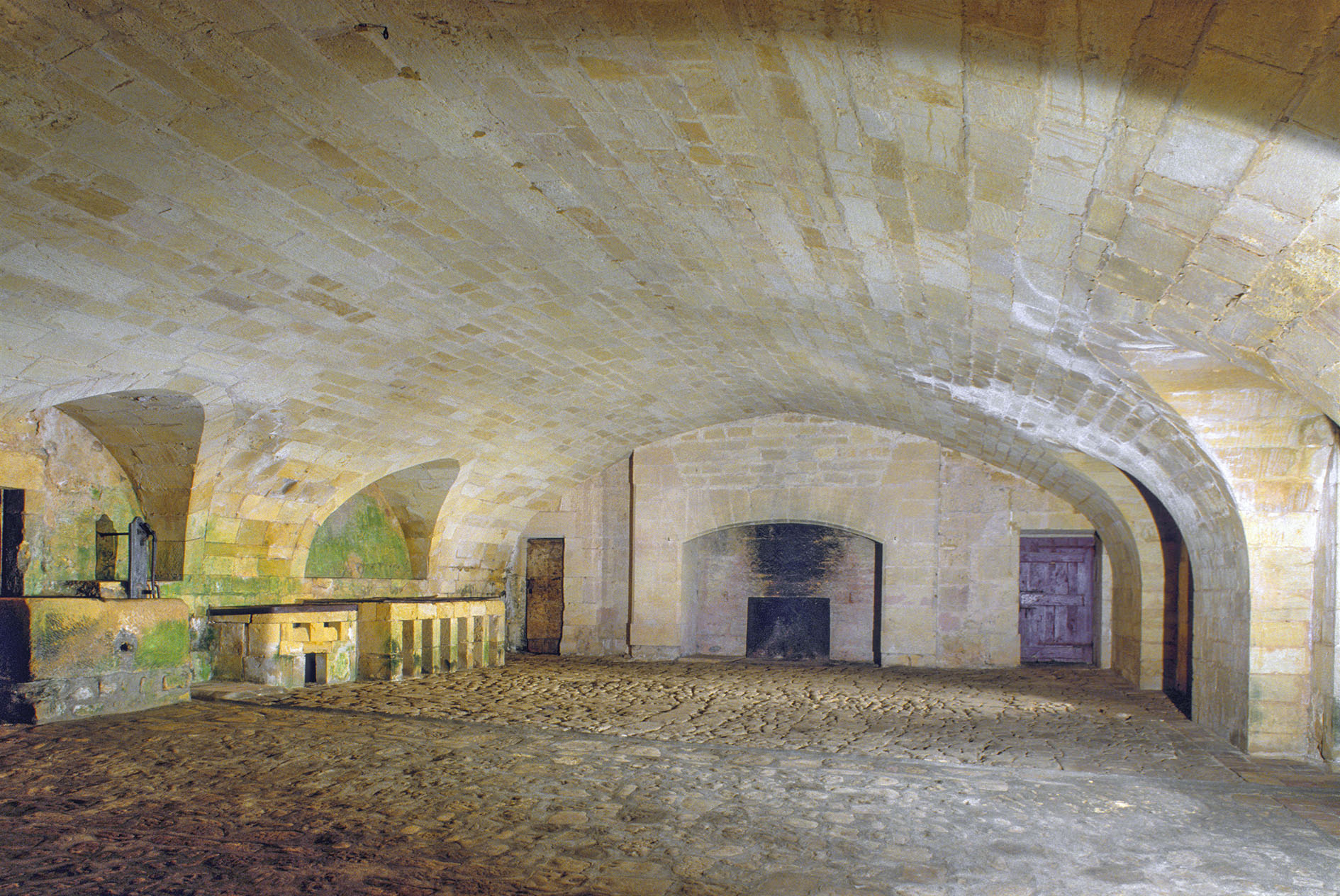 Les chateaux et manoirs du Perigord, le chateau de Biron, ici vue interieure partielle de la grande cuisine du logis neuf (fin XVIe-debut XVIIe) eclairee par trois projecteurs de 1000 W, elle occupe une vaste salle pavee d’enormes blocs de pierre avec a chaque extremite une grande cheminee, sa voute surbaissee en pierre de taille, immense, fut construite en 1721 par l’ingenieur bordelais Pierre Tranchant apres s’etre ecroulee une premiere fois vers 1715 avec un autre ingenieur qui fut renvoye, eclairee de trois petits jours a l’O., sa paroi de l’E., celle du potager ici a gauche, jouxte la citerne creusee sous la cour par un certain Ricard, maitre fontainier de Bordeaux, edifice protege au titre des monuments historiques, photo prise apres avoir obtenu l’autorisation du proprietaire, commune de Biron, Dordogne, France, Europe.
